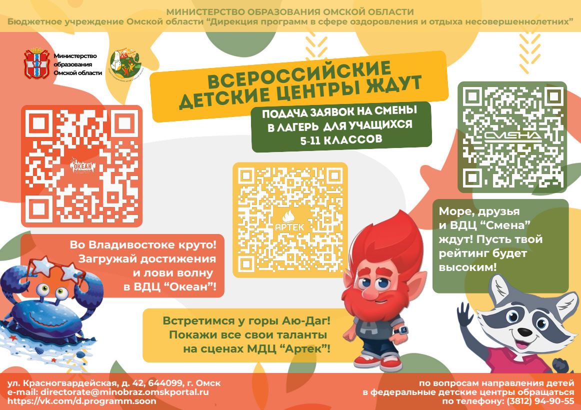 В рамках организации работы по направлению детей Омской области в федеральные государственные бюджетные образовательные учреждения «Международный детский центр «Артек», «Всероссийский детский центр «Орленок», «Всероссийский детский центр «Океан» и «Всероссийский детский центр «Смена» прилагаем информационный плакат, содержащий сведения о способах и порядке получения путевок в Центры.
