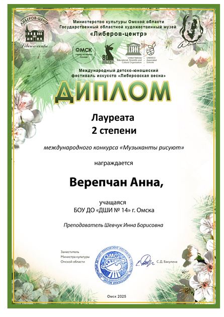 В Омске прошел конкурс « Музыканты рисуют» в рамках Международного детско-юношеского фестиваля искусств « Либеровская весна». Верепчан Анна завоевала на нем Гран-при.